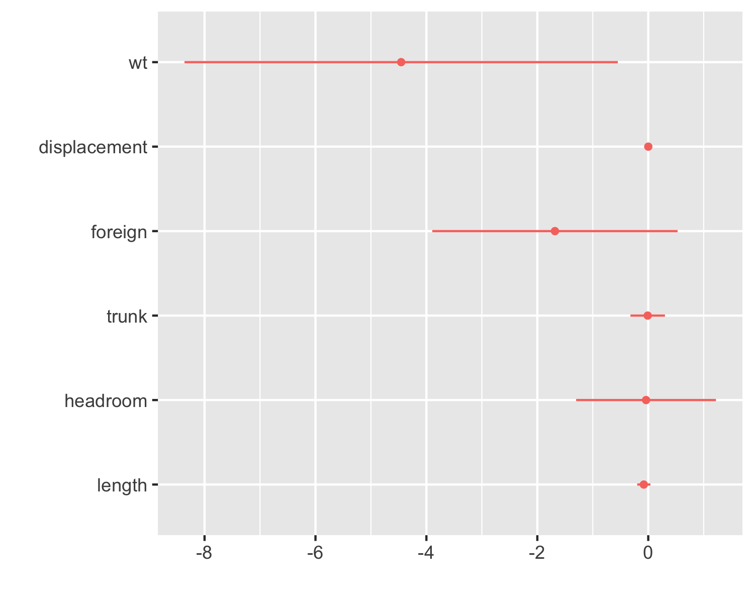 With the APSA coming up, and in the interest of minimizing the number of times we hear “sorry, I know you won’t really be able to see these regression coefficients,” I thought I’d point R users to dotwhisker, a package UI Ph.D. student Yue HU and I just published to CRAN. dotwhisker makes regression plots in the style of Kastellec and Leoni’s (2007) Perspectives article quick and easy: after data entry, just two lines of R code produced the easy-to-read-even-from-the-back-of-the-room plot attached to this post. I hope you’ll find it useful, and if you have any suggestions for us, that you’ll file an issue at https://github.com/fsolt/dotwhisker, tweet to me @fredericksolt, or just send me an email [email protected].