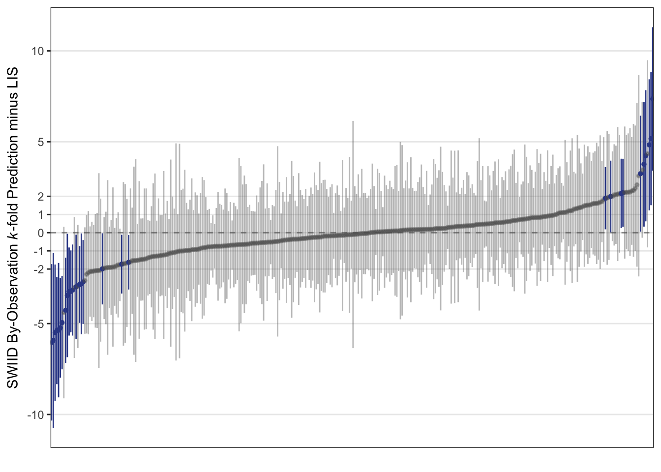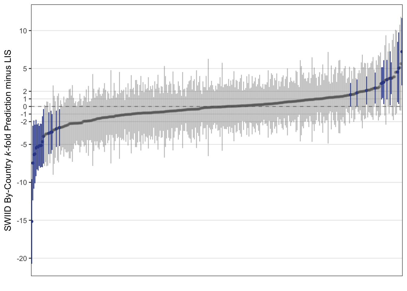 To provide a first assessment of the SWIID’s ability to predict the LIS, I randomly assigned the available LIS observations into groups of three, with an added check to ensure that no group included two observations from the same country.3 (Because the SWIID routine relies only on relationships observed within-country for the countries included in the LIS, the check that only a single observation from a country be assigned to the test data at a time means that the exact size of the group doesn’t really matter.)4 The figure below plots the difference between the SWIID prediction generated from this k-fold cross-validation and the LIS data for each country-year included in the LIS. Observations for which the 95% credible interval for this difference includes zero are gray; those for which it doesn’t are highlighted in blue.