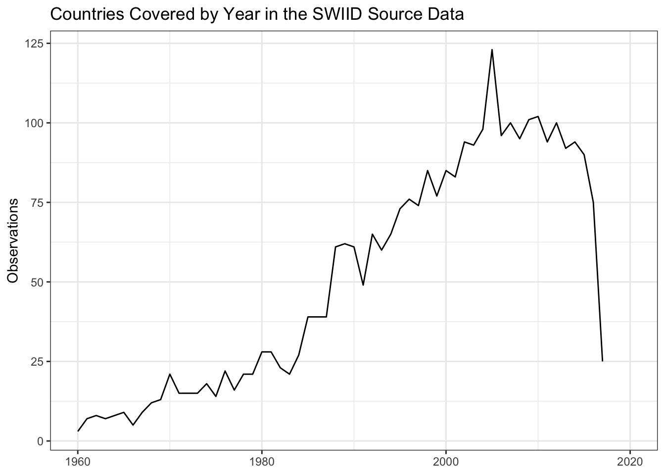 We can also get a sense of the available inequality data by turning the question around and asking about coverage across countries over time. There are observations for 123 countries in 2005. Coverage is relatively good in the years from 2000 to 2015, at least 80 countries per year, before dropping to 75 countries for 2016 and just 25 for 2017. Country coverage is pretty thin each year through the 1960s and 1970s and still isn’t all that great until the late 1980s.10