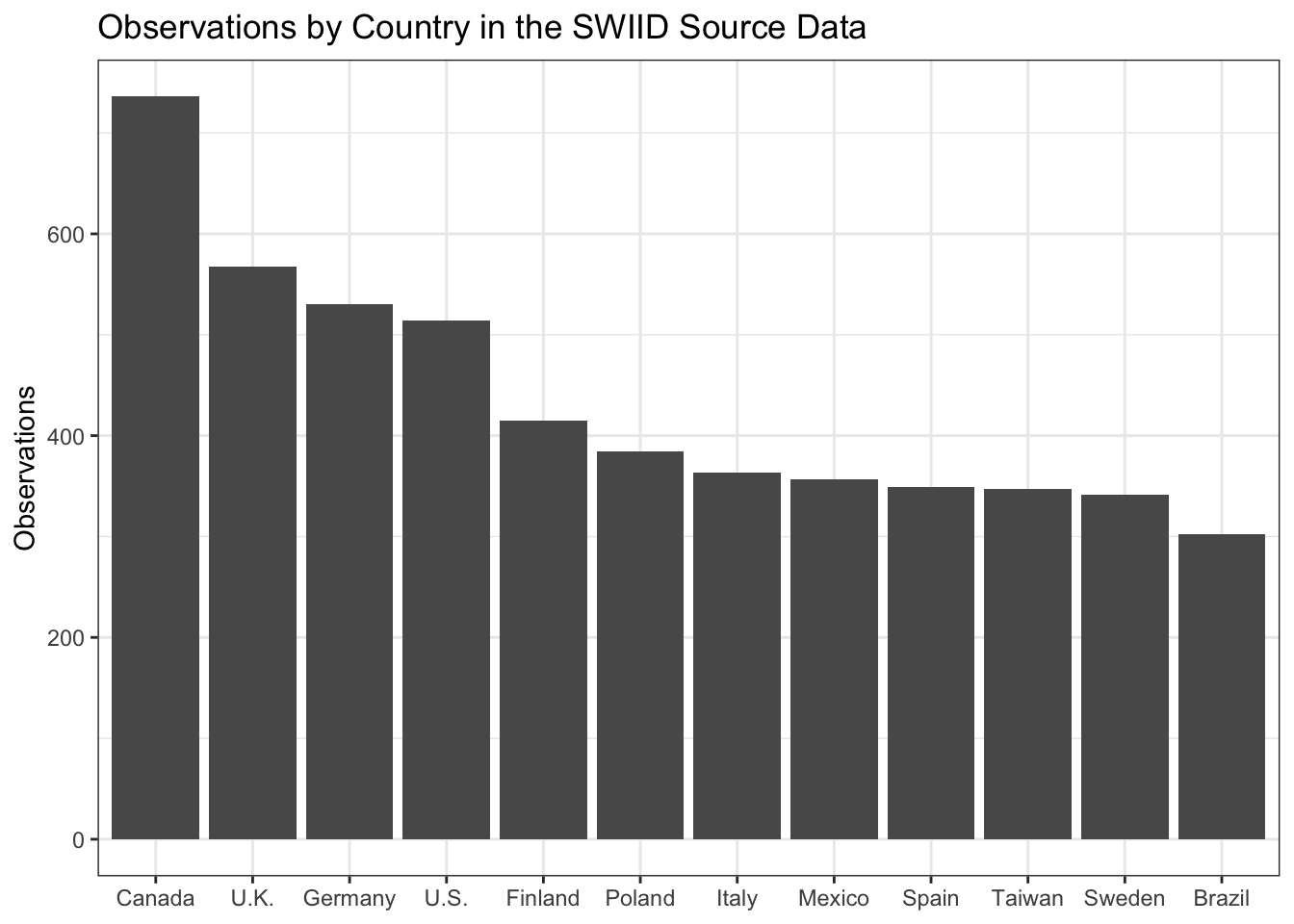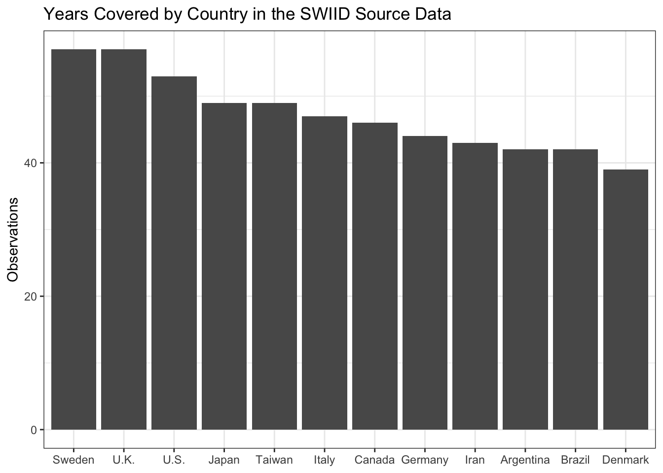 The source data includes observations for Sweden and the United Kingdom in all but one of these years and for the United States in all but five. Iran and Argentina—two countries not included in the LIS—make the top 12, with 43 and 42 country-year observations respectively. The median country has observations in 16 different country-years.