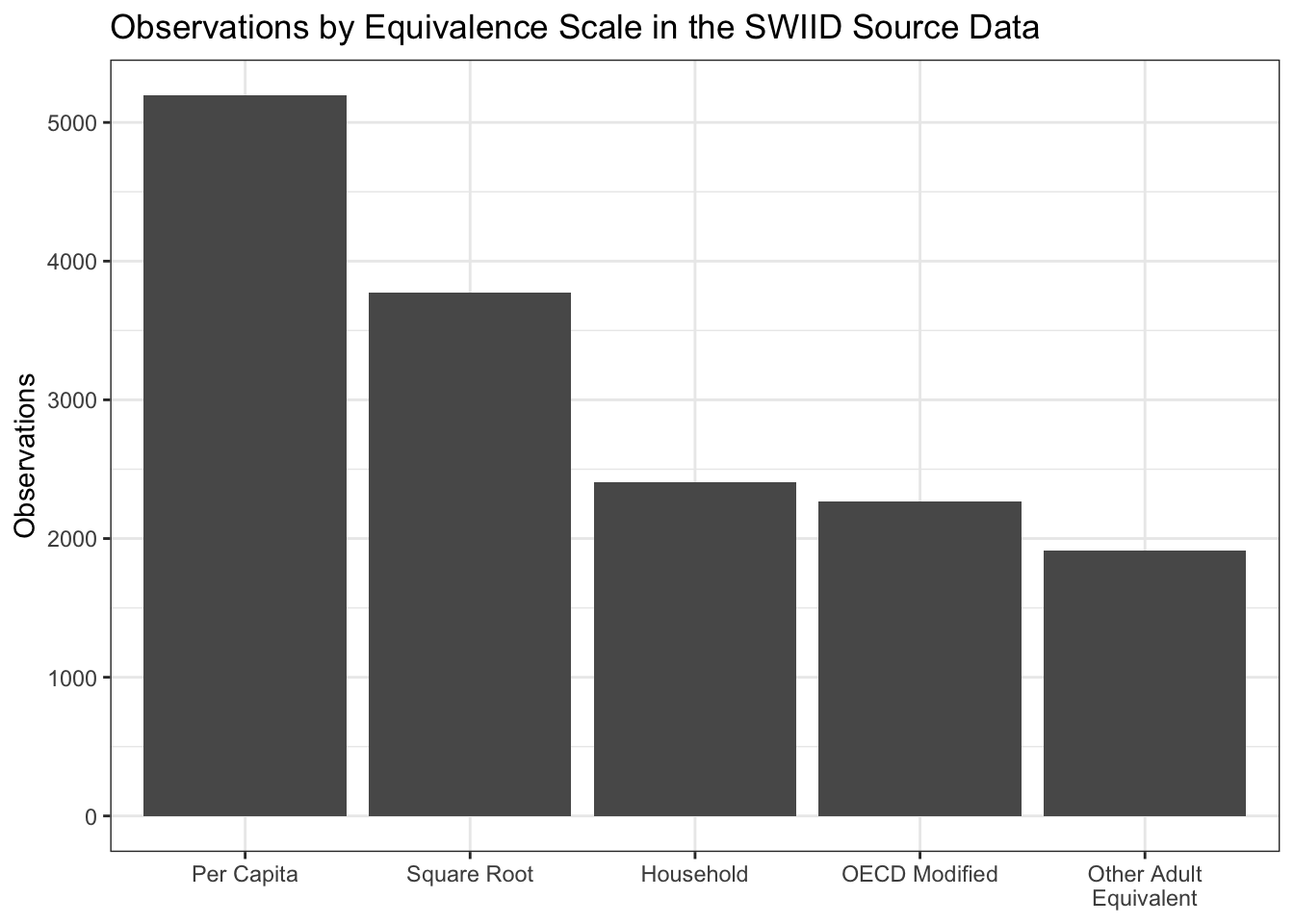 Equivalence scales are the ways in which the size and composition of a household is incorporated into the calculation of its members’ welfare. On the one hand, these factors can simply be ignored, with all households with the same amount of income or consumption treated as if they enjoy the same level of welfare, regardless of their size. One can improve on this household ‘scale’14 by dividing the household’s income by its number of members, that is, by using a per capita scale. But a household of two members and an income of $100,000 is better off than one with a single member and $50,000 due to economies of scale—that’s a big reason why people look for roommates. There are a variety of ways to try to account for these economies by calculating the number of “equivalent adults” in the household. Of the most commonly used adult-equivalent scales, the square-root scale is the most straightforward: one simply divides the household income by the square root of the number of members. The “OECD-modified” scale for the number of adult equivalents (which the OECD itself actually never used) counts the first adult as 1, all other adults as .5, and each child as .3. And there are plenty of other adult-equivalent scales, from the “old OECD” scale (1 for the first adult, 0.7 for each additional adult, and 0.5 for each child) to caloric-requirement-based scales (which are actually very nearly per capita, as it turns out) to a number of country-specific scales. In previous versions of the SWIID, all adult-equivalent scales were considered a single category. Now, the square-root scale and the OECD-modified scale have both been split out, leaving the remaining catch-all adult-equivalent category much smaller.