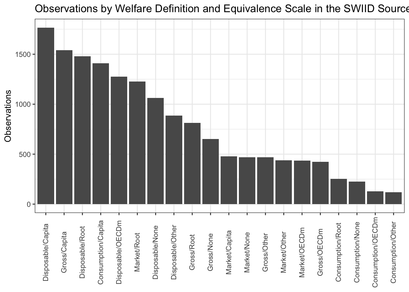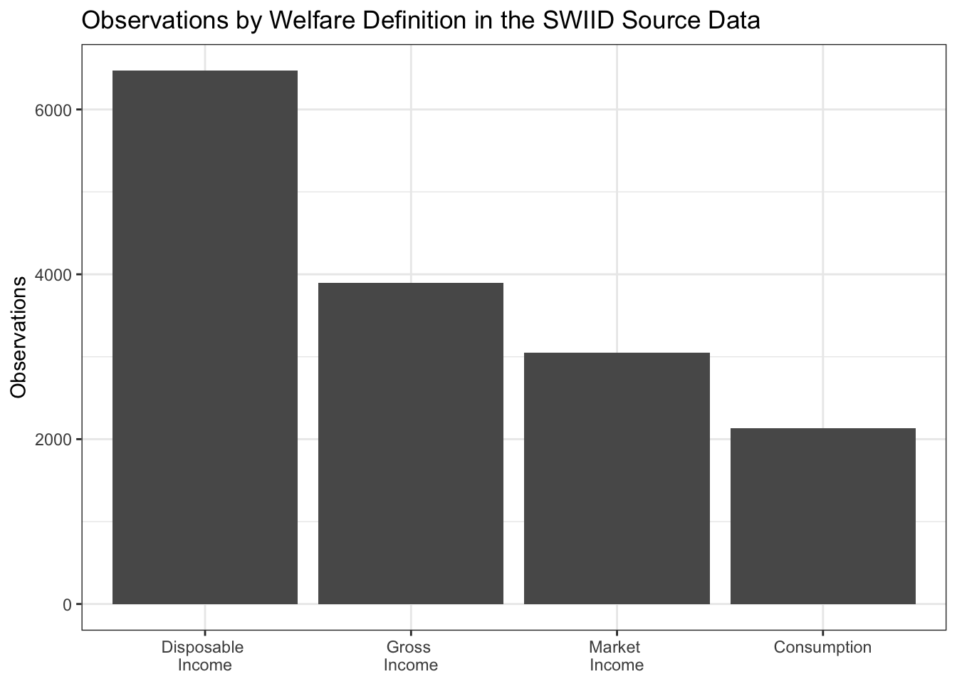 In previous versions of the SWIID, market and gross income were treated as a single welfare definition, and I am glad to finally be able to split them apart (c.f., Solt 2016, 1272). The consumption welfare definition might now be the most heterogeneous within the SWIID source data, varying considerably in whether and how observations treat expenditures on durable goods. Another source of differences within a single welfare definition is the extent to which nonmonetary income—such as the value of food grown for the household’s own consumption or of housing that the owner occupies—is included. The SWIID source data include the variable