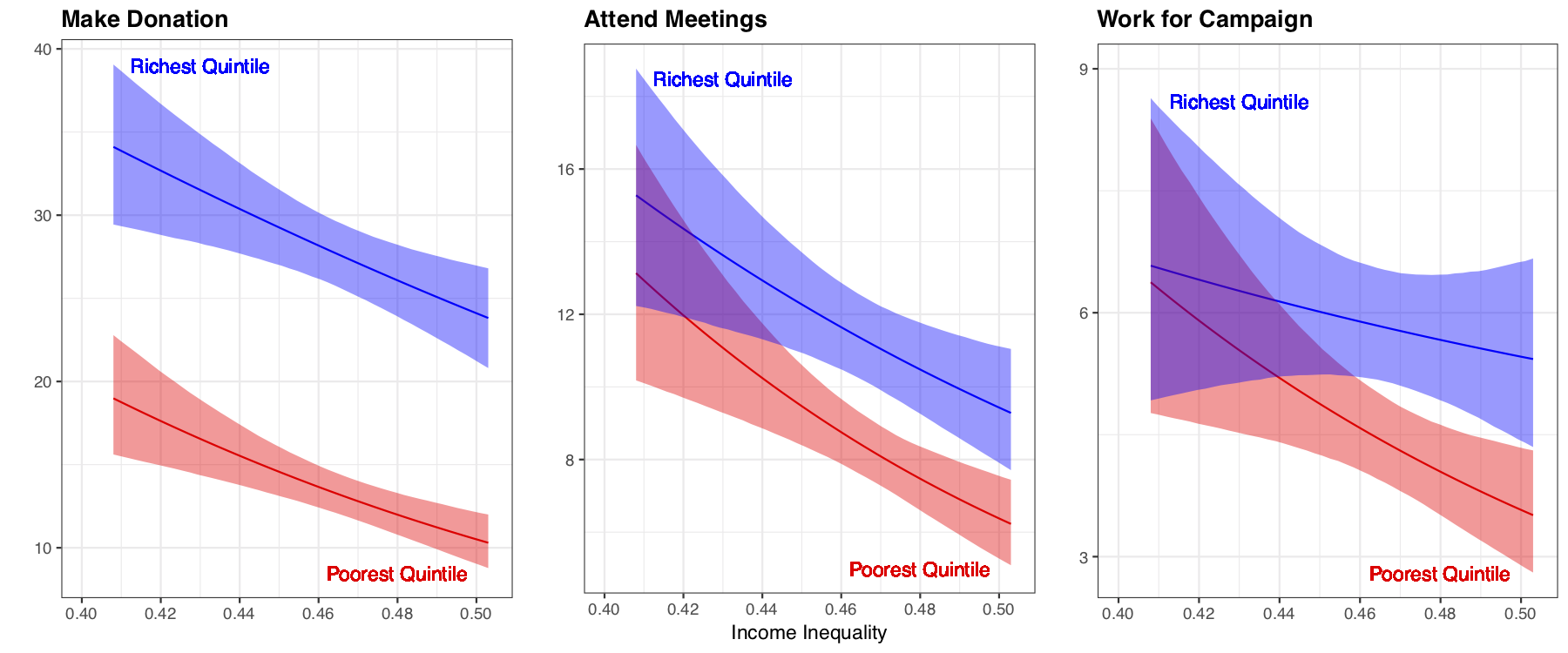 Objective. How does economic inequality shape participation in political campaigns? Previous research has found that higher inequality makes people of all incomes less likely to participate in politics, consistent with relative power theory, which holds that greater inequality enables wealthier citizens to more fully reshape the political landscape to their own advantage. Campaign activities, however, demand more time and money than previously examined forms of participation and so might better conform to the predictions of resource theory, which focuses narrowly on the ramifications of inequality for individuals’ resources. Methods. We combine individual-level data on donations, meeting attendance, and volunteer work for political campaigns with measures of state-level income inequality to construct a series of multilevel models. Results. The analyses reveal that where inequality is higher, campaign participation is lower among individuals of all incomes. Conclusions. Patterns of participation in even resource-intensive campaign activities provide support for the relative power theory.