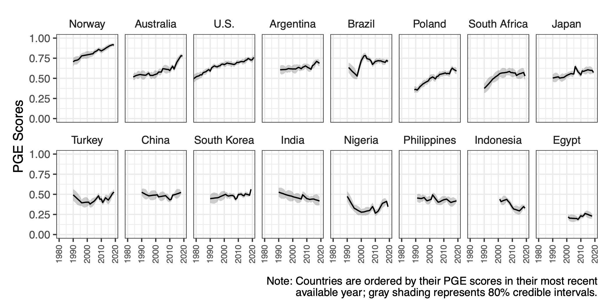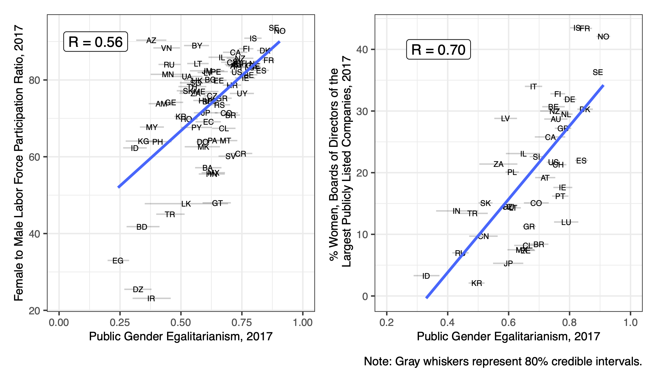 Societal attitudes toward gender roles in the workplace and politics play a central part in theorizing on the difficulty women face in achieving political equality, but shortcomings in the available data have prevented direct examination of many implications of these theories. Drawing on recent advances in latent variable modeling of public opinion and a comprehensive collection of survey data, we present the Public Gender Egalitarianism dataset to address this need: comparable estimates of the public’s attitudes on gender equality in the public sphere across more than one hundred countries over time. These PGE scores are strongly correlated with responses to individual survey items and with women’s rates of participation in the labor force and corporate boards. We expect that the PGE data will become an invaluable source for broadly cross-national and longitudinal research on the causes and consequences of collective attitudes toward gender equality in politics and the economy.